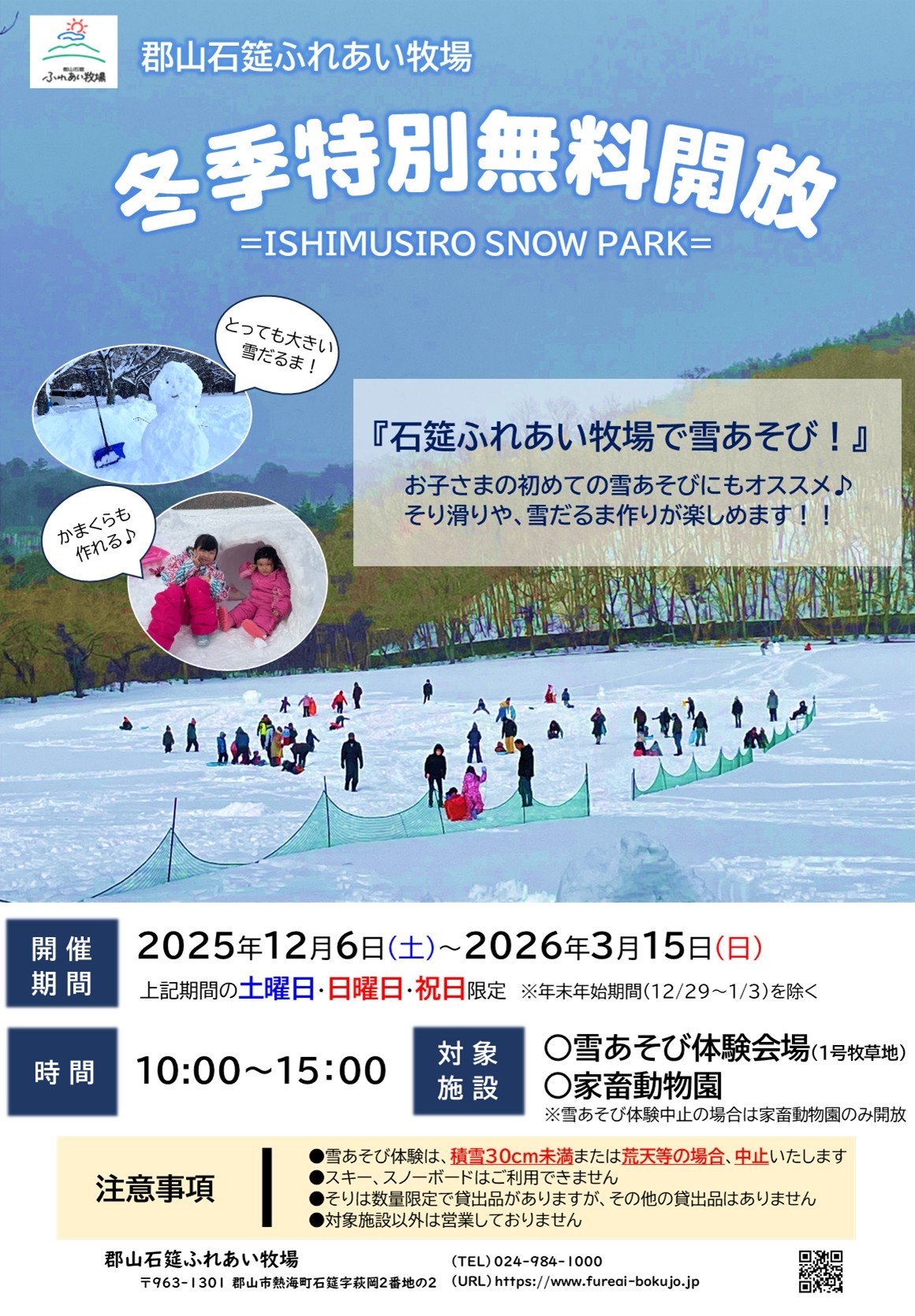 郡山石筵ふれあい牧場は、12月1日より冬季閉場となりますが、土日祝日に限り、『雪あそび体験』として牧草地の一部と、家畜動物園の無料開放を実施いたします。