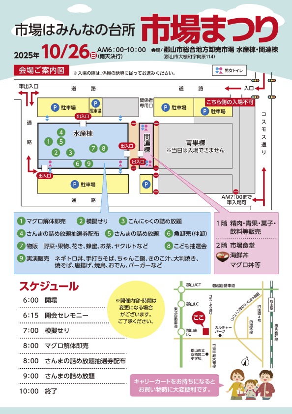 ※毎月第4日曜日の「市場の朝市」は、現在は開催しておりません。現在、一般の方が購入できるイベントは「市場まつり」のみです。